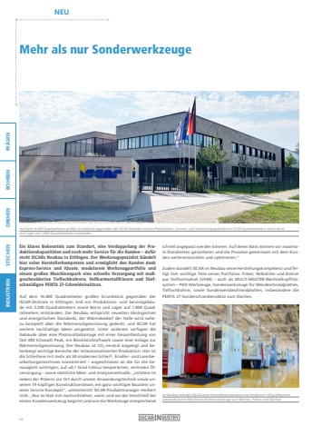 FR%u00c4SEN BOHREN DREHEN STECHEN INDUSTRIENNEUMehr als nur SonderwerkzeugeAuf dem 16.000 Quadratmeter gro%u00dfen Grundst%u00fcck gegen%u00fcber der ISCAR-Zentrale sind ein Produktions-, Service- und Verwaltungsgeb%u00e4ude mit 3.200 Quadratmetern sowie B%u00fcros und Lager auf 1.800 Quadratmetern entstanden.Im Neubau b%u00fcndelt ISCAR seine Herstellerkompetenz und fertigt auf 100 gr%u00f6%u00dftenteils automatisierten Maschinen Sonderwerkzeuge zum Bohren, Fr%u00e4sen und Stechen.schnell angepasst werden k%u00f6nnen. Auf dieser Basis k%u00f6nnen wir maximale Standzeiten garantieren und die Prozesse gemeinsam mit dem Kunden weiterentwickeln und optimieren.%u201cZudem b%u00fcndelt ISCAR im Neubau seine Herstellungskompetenz und fertigt hier wichtige Teile seines Portfolios: Fr%u00e4ser, Reibahlen und Bohrer aus Vollhartmetall (VHM) %u2013 auch als MULTI-MASTER-Wechselkopffr%u00e4ssystem %u2013 PKD-Werkzeuge, Sonderwerkzeuge f%u00fcr Wendeschneidplatten, Tieflochbohrer, sowie Sonderwendeschneidplatten, insbesondere die PENTA 27-Sonderschneideins%u00e4tze zum Stechen.Ein klares Bekenntnis zum Standort, eine Verdoppelung der Produktionskapazit%u00e4ten und noch mehr Service f%u00fcr die Kunden %u2013 daf%u00fcr steht ISCARs Neubau in Ettlingen. Der Werkzeugspezialist b%u00fcndelt hier seine Herstellerkompetenz und erm%u00f6glicht den Kunden dank Express-Service und iQuote, modularem Werkzeugportfolio und einem gro%u00dfen Maschinenpark eine schnelle Versorgung mit ma%u00dfgeschneiderten Tieflochbohrern, Vollhartmetallfr%u00e4sern und f%u00fcnfschneidigen PENTA 27-Schneideins%u00e4tzen.Auf dem 16.000 Quadratmeter gro%u00dfen Grundst%u00fcck gegen%u00fcber der ISCAR-Zentrale in Ettlingen sind ein Produktions- und Servicegeb%u00e4ude mit 3.200 Quadratmetern sowie B%u00fcros und Lager auf 1.800 Quadratmetern entstanden. Der Neubau entspricht neuesten %u00f6kologischen und energetischen Standards, der W%u00e4rmebedarf der Halle wird nahezu komplett %u00fcber die W%u00e4rmer%u00fcckgewinnung gedeckt, und ISCAR hat weitere nachhaltige Ideen umgesetzt. Unter anderem verf%u00fcgen die Geb%u00e4ude %u00fcber eine Photovoltaikanlage mit einer Gesamtleistung von fast 480 Kilowatt Peak, ein Blockheizkraftwerk sowie eine Anlage zur W%u00e4rmer%u00fcckgewinnung. Der Neubau ist CO2-neutral angelegt und beherbergt wichtige Bereiche der teilautomatisierten Produktion: Hier ist die Schleiferei mit mehr als 50 modernen Schleif-, Erodier- und Laserbearbeitungsmaschinen konzentriert %u2013 angeschlossen an die f%u00fcr die Genauigkeit wichtigen, auf %u00b10,1 Grad Celsius temperierten, zentralen %u00d6lversorgung %u2013 sowie s%u00e4mtliche Mess- und Analysemethodik. %u201eLetztere ist neben der Pr%u00e4senz vor Ort durch unsere Anwendungstechnik sowie unserem 19-k%u00f6pfigen Konstruktionsteam, ein ganz wichtiger Baustein unseres Service-Konzepts%u201c, unterstreicht ISCAR-Produktmanager Herbert Volk. %u201eNur so l%u00e4sst sich nachvollziehen, wann und wo der Verschlei%u00df bei einem Kundenwerkzeug beginnt und wie die Werkzeuge entsprechend 64